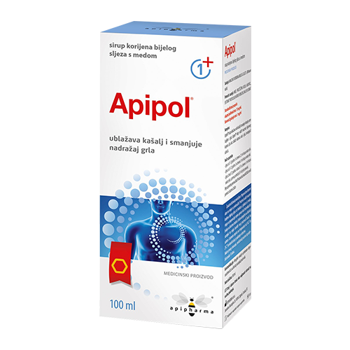 Apipharma Apipol sirup sadrži med, macerat sljezovog korijena i tinkturu propolisa. Ublažava suhi kašalj i smanjuje iritaciju usne šupljine i grla. Sadrži macerat korijena bijelog sljeza čija sluz oblaže sluznicu usta i grla te stvara zaštitni film. Na taj način smanjuje suhoću, iritaciju i nadražaj grla. Izdvaja se zbog svog sastava jer osim bijelog sljeza sadrži još i med kao i standardizirani propolis. Namijenjen je djeci od 1. godine života i odraslima.