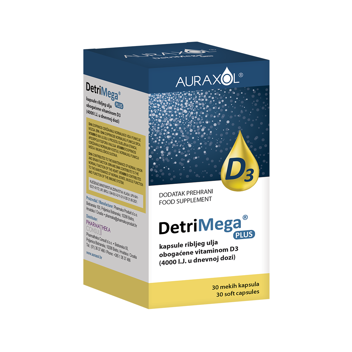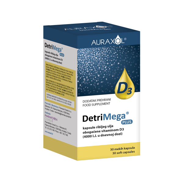 DetriMega PLUS je funkcionalni dodatak prehrani u obliku mekih kapsula. Sadrži riblje ulje farmaceutske kakvoće, bogato esencijalnim masnim kiselinama EPA i DHA (omega-3) i vrlo visoku dozu vitamina D3 (2000% preporučenog dnevnog unosa). Riblje ulje proizvedeno je od mesa divljeg inćuna, male ribe koja živi u jatima i lovi se u zimskim mjesecima, kada nije u mrijestu. Jata inćuna zimi odlaze u morske dubine gdje nema rizika od zagađenja teškim metalima, naftom ili mikroplastikom. Zbog specifičnog sastava omega-3 masnih kiselina, uz dodatak megadoze vitamina D3, ove se kapsule preporučuju uvijek kada je organizmu potrebno nadoknaditi deficit vitamina D i obogatiti prehranu esencijalnim masnim kiselinama. Osobito se preporučuju za očuvanje zdravlja srca i krvožilnog sustava, jačanje imuniteta i brži oporavak organizma nakon viroze, gripe i različitih virusnih infekcija dišnog sustava.