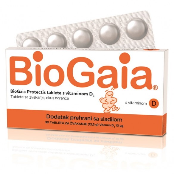 BioGaia Protectis tablete s vitaminom D3 su dodatak prehrani koji sadrži Limosilactobacillus reuteri Protectis (DSM 17938) i Vitamin D3, sa sladilom, okusa naranče u obliku tableta za žvakanje.