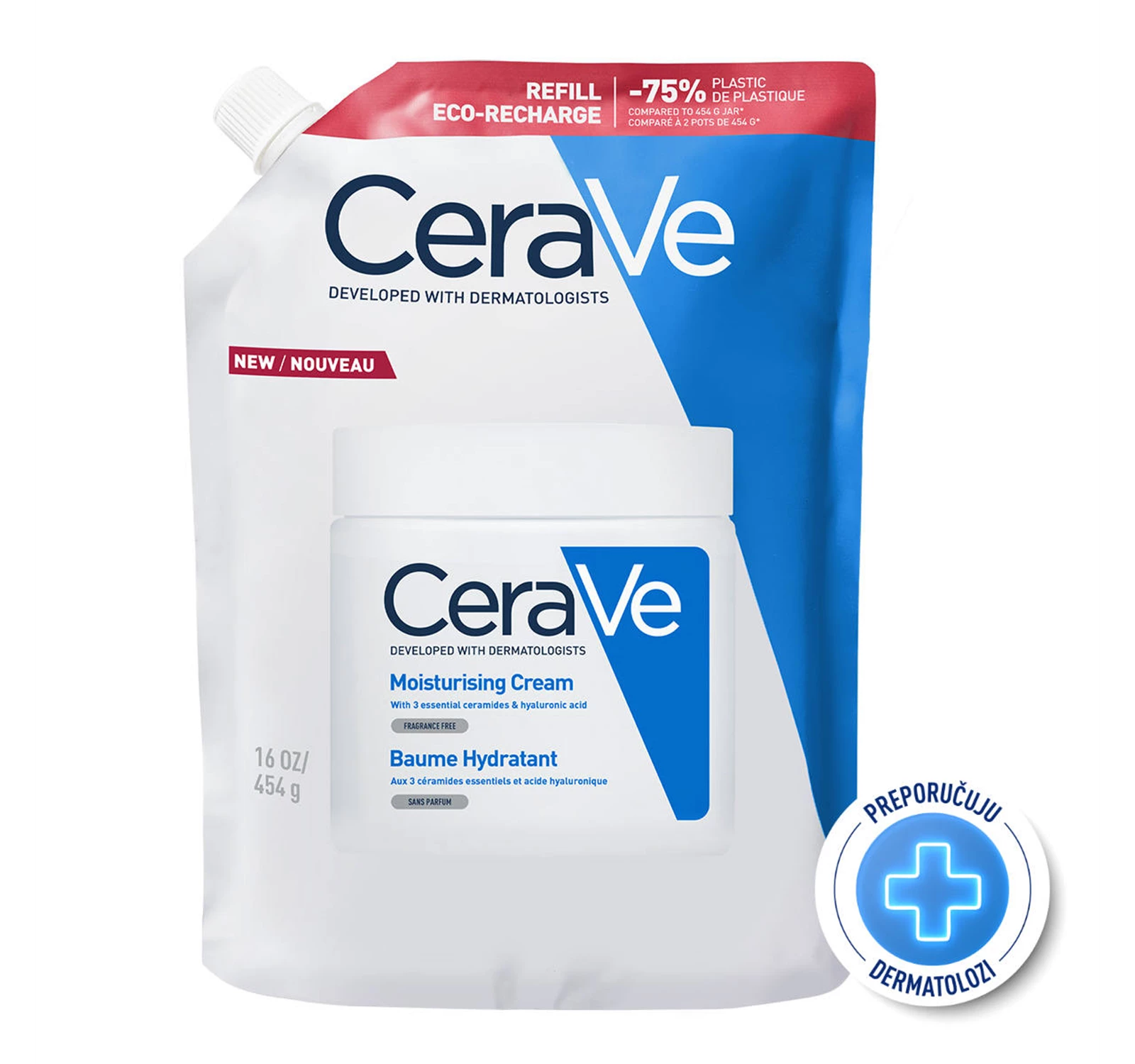 CeraVe hidratantna krema sadržava tri esencijalna ceramida i hijaluronsku kiselinu za učinkovitu hidraciju kože i obnovu njezine zaštitne barijere.