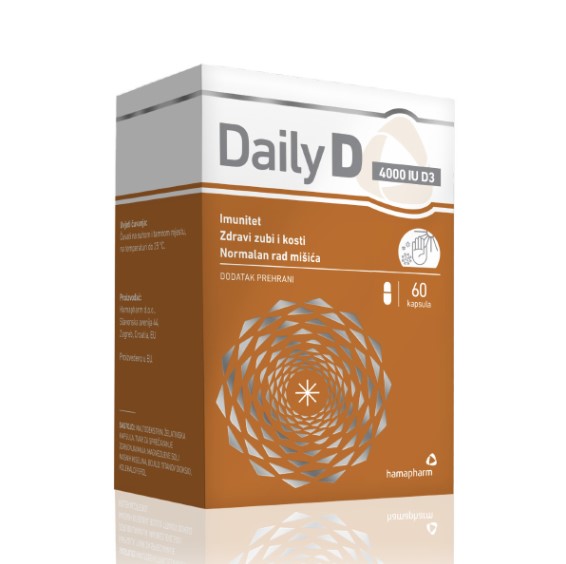 Daily D 4000 IU kapsule sadrže vitamin D3 u maksimalnoj dnevnoj dozi u samo jednoj kapsuli. Daily D 4000 IU kapsule sadrže vitaimn D 3 iz prirodnog izvora. Praktične su za uzimanje jednom dnevno nakon jela. Vitamin D doprinosi normalnoj radu imunološkog sustava, odražavanju zdravih kosti i zuba, radu mišića. Dodatak prehrani.