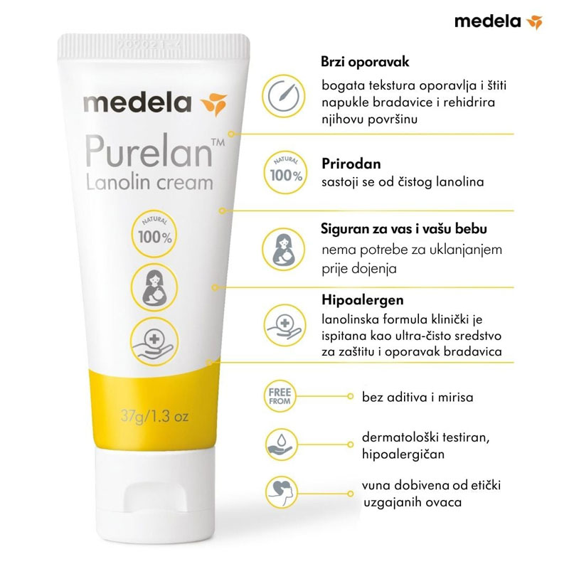Ako imate suhe, ispucale ili bolne bradavice, Medela Purelan krema za bradavice od lanolina nudi prirodnu umirujuću njegu i zaštitu – a sigurna je za vas i vašu bebu tijekom dojenja.