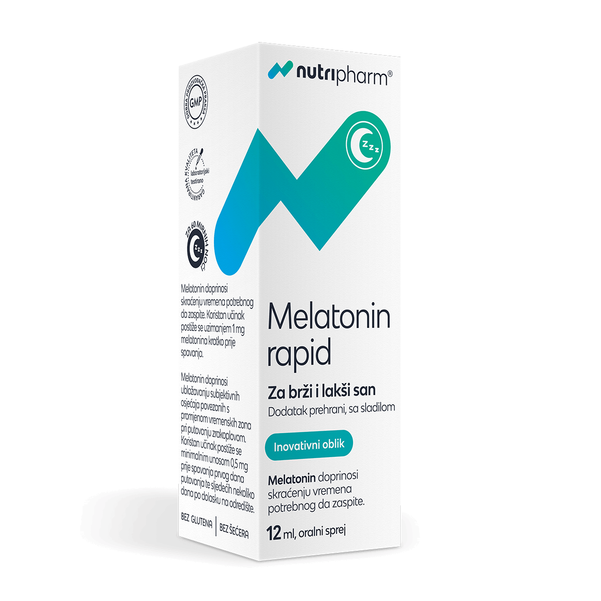 Nutripharm Melatonin rapid oralni sprej je posebno dizajnirana i patentirana emulzija melatonina u spreju za brži i lakši san. Zahvaljujući oralnoj primjeni spreja, osigurana je bolja apsorpcija i brže djelovanje.