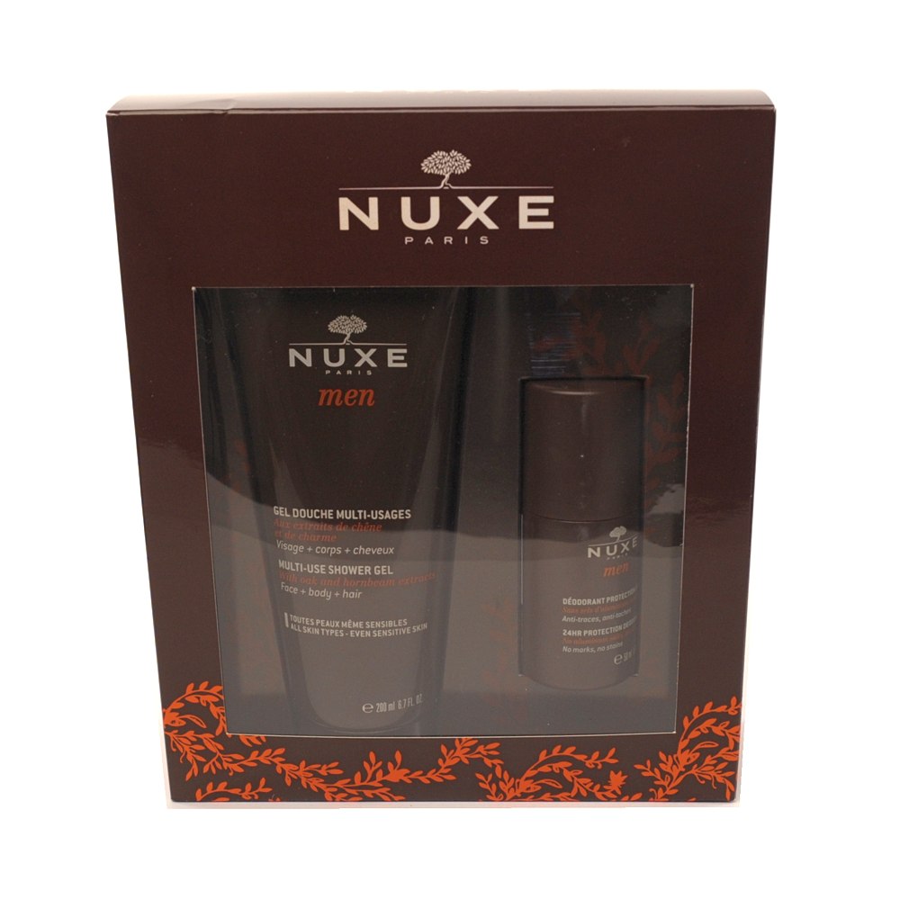 Nuxe men poklon paket sadrži višenamjenski gel za tuširanje i 24-satni zaštitni roll-on dezodoransa.