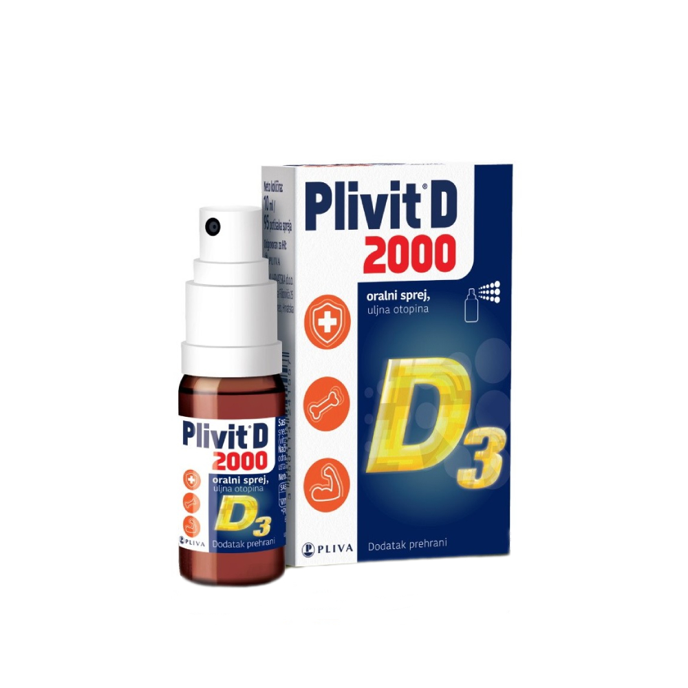 Plivit D 2000 oralni sprej je dodatak prehrani koji u jednom potisku sadrži 2000 IU vitamina D u obliku kolekalciferola.