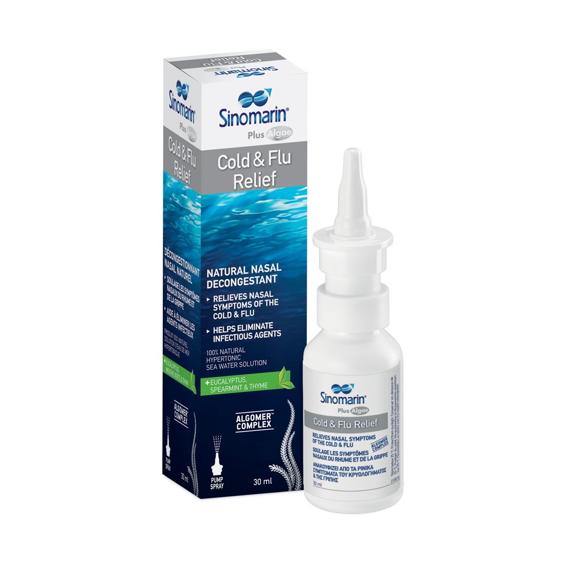 Sinomarin® Plus Algae Cold & Flu Relief with Algomer™ Complex je novi, 100% prirodni sprej za nos koji ublažava simptome nazalne infekcije povezane s prehladom i gripom. Pametno kombinira morsku vodu (hipertonična otopina; 2,3% NaCl) s eukaliptusom, metvicom i timijanom i jedinstvenom mješavinom prirodnih sastojaka morskih algi koji štite nosno tkivo od kontakta ili ulaska štetnih vanjskih čimbenika (npr. virusa, bakterija, itd.), pružajući dodatnu snagu i zaštitu nosne sluznice.