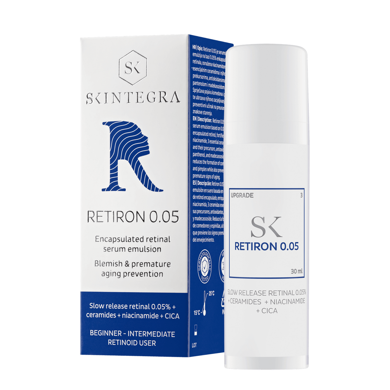 Skintegra Retiron 0.05 je serumska emulzija na bazi 0.05% enkapsuliranog retinala, osnažena niacinamidom, trima esencijalnim ceramidima i njihovim prekursorima, antioksidansima, pantenolom i madekasozidom.